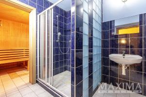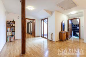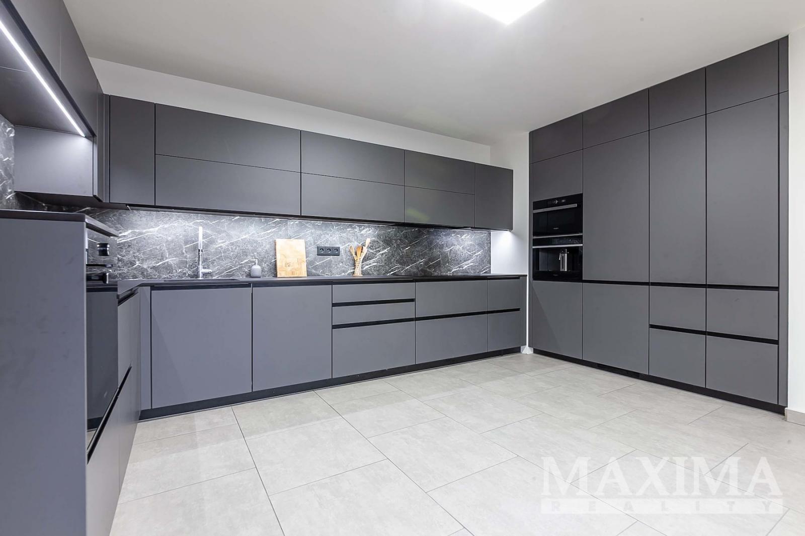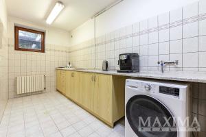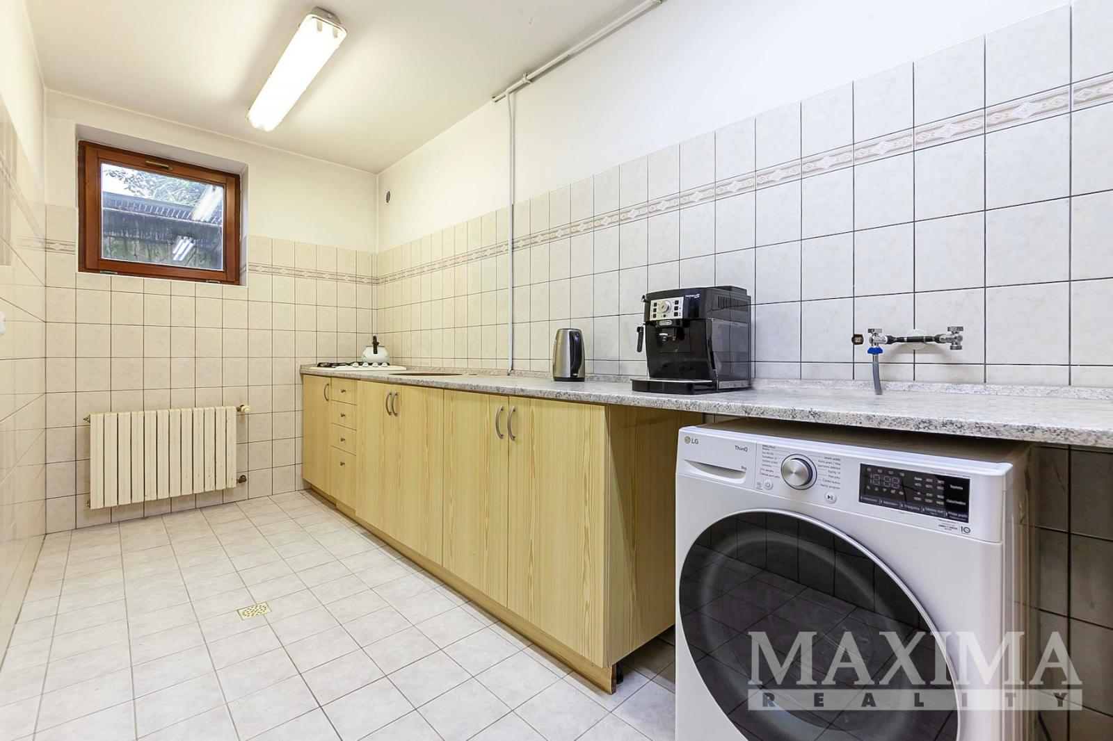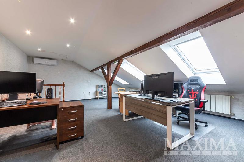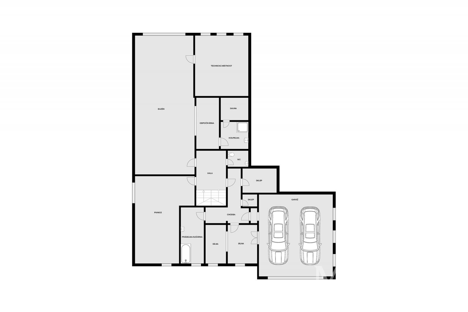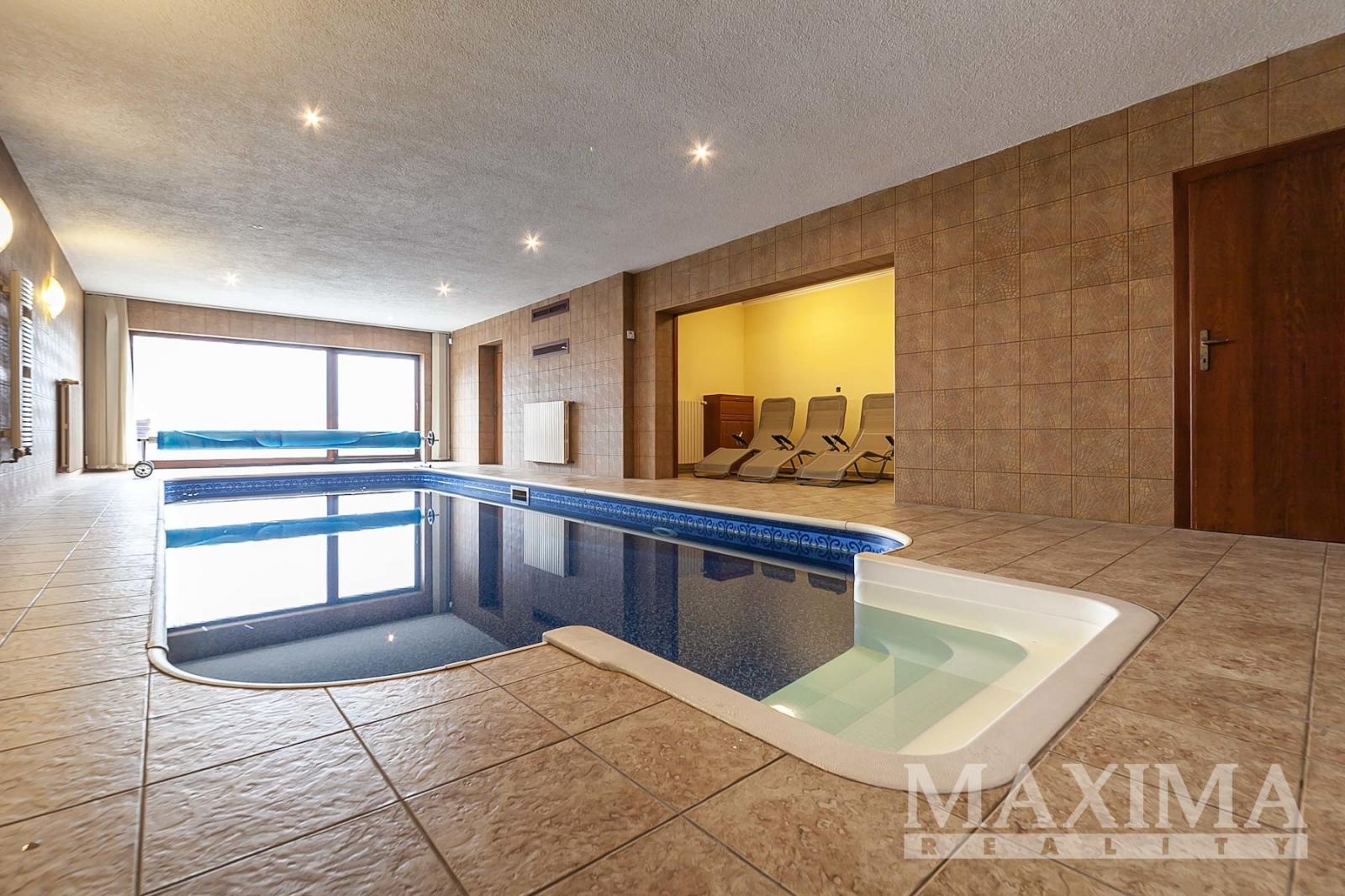 3 podlaží ukrývají 9 místností, fitness, dílnu a garáž pro 2 vozidla v suterénu, kde je také vnitřní bazén o velikosti 43 m2 s protiproudem, sauna, odpočívárna a koupelna.