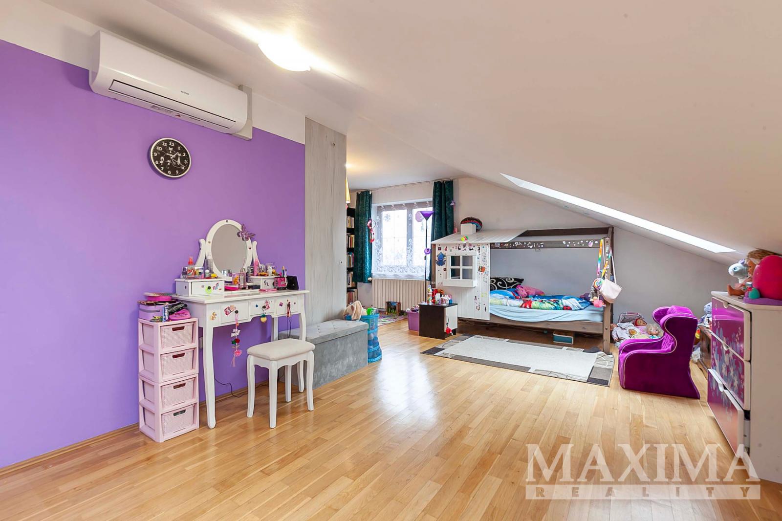 V patře je z haly vstup do ložnice se šatnou a dvou pokojů. V každém podlaží je koupelna s toaletou.