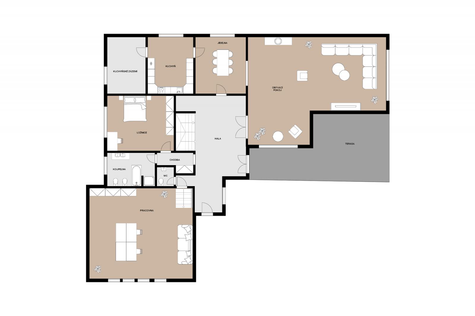 V přízemí nalezneme velkou halu, ze které vstoupíme do pracovny, oddělené ložnice, vhodné jako pokoj pro hosty a pokračujeme do obývacího pokoje s krbem a vstupem na terasu, který sousedí s jídelnou a opravdu velkou kuchyní.