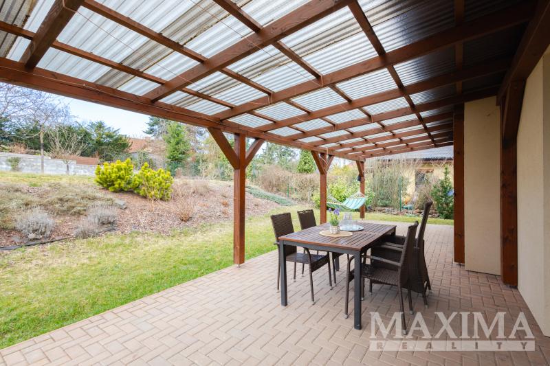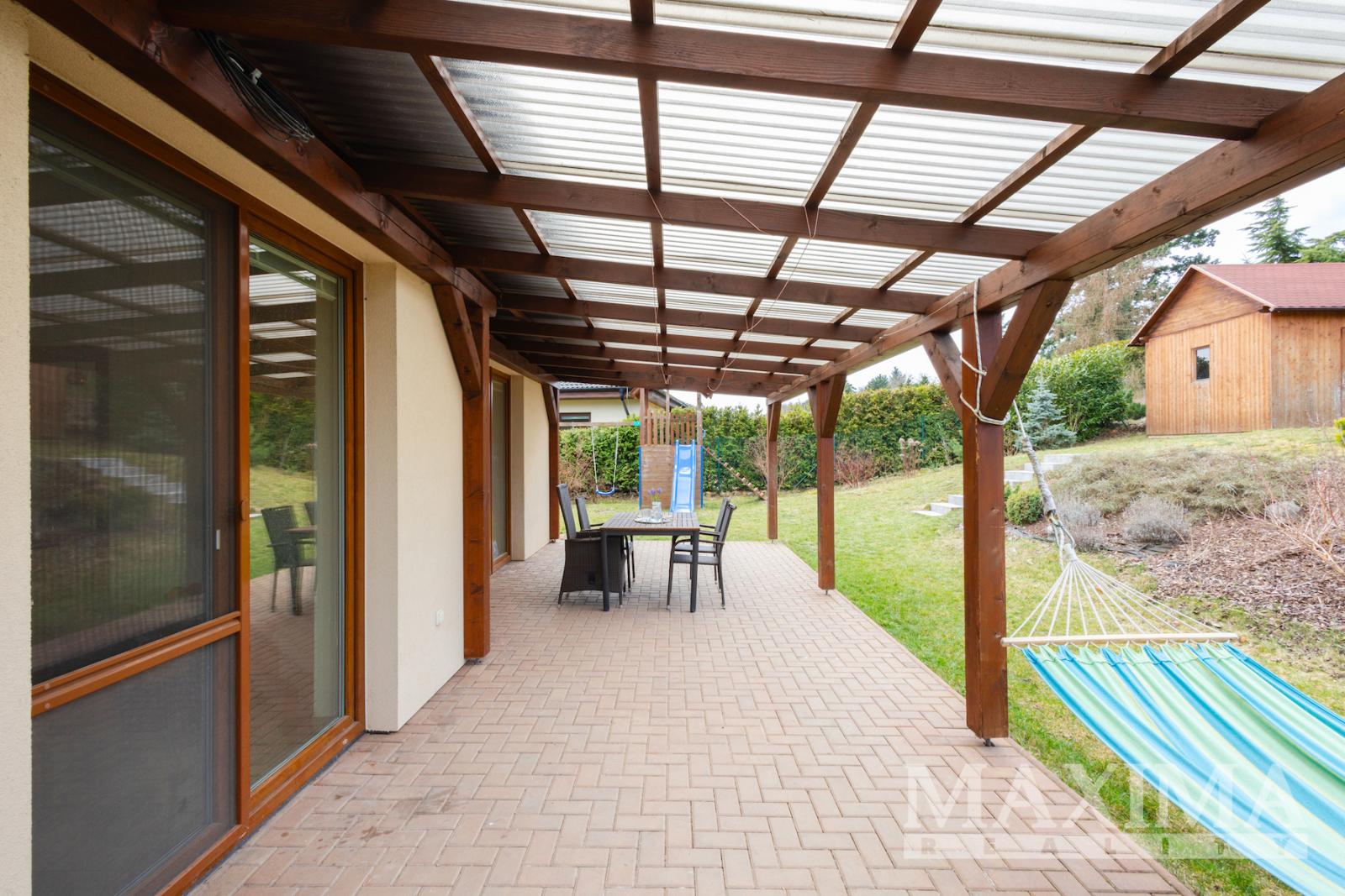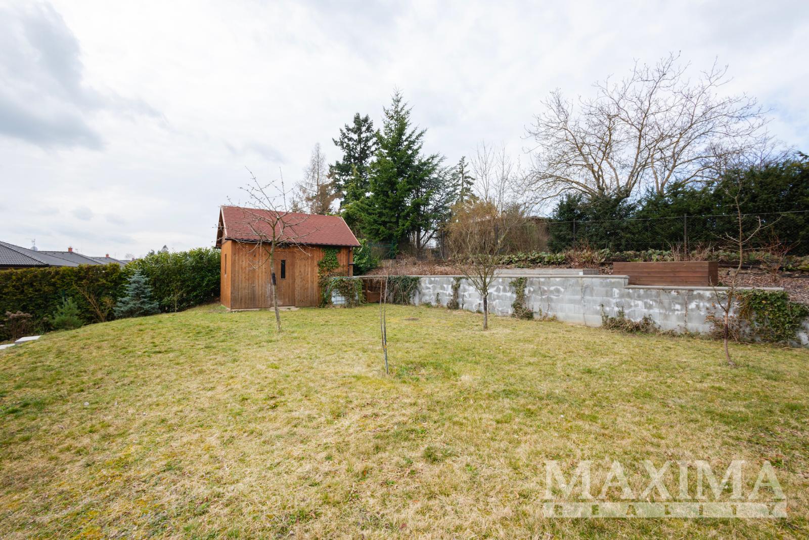 Zahrada je udržovaná, s živým plotem, je zde k dispozici dvoupodlažní dřevěný zahradní domek a také dětské hřiště s herními prvky a houpačkou. Jihozápadně orientovaná terasa s pergolou pak nabízí dostatek soukromí a příjemné posezení i v letních měsících. Na pozemku jsou také dvě retenční nádrže na zalévání o objemu dvou kubíku. Parkování pro dvě auta je možné na pozemku před domem.