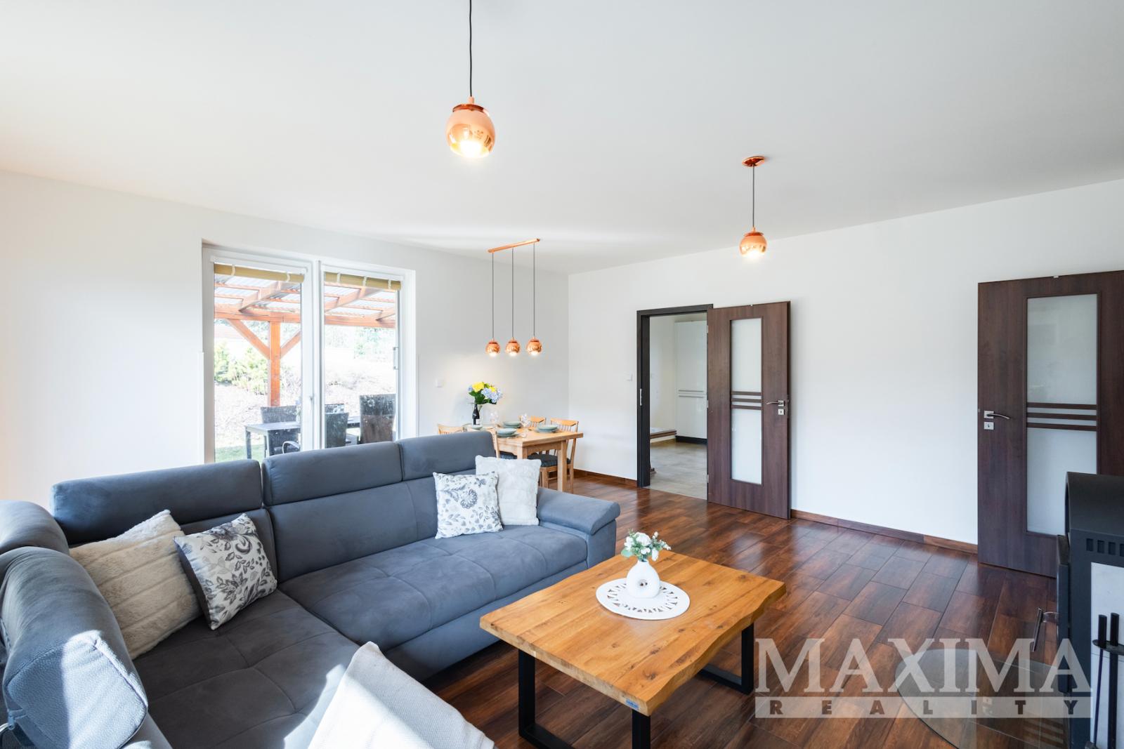 Dispozici domu 5+1 tvoří 4 samostatné pokoje, obývací pokoj a oddělená kuchyně. K dispozici jsou dvě toalety jedna samostatná s umývátkem, druhá je pak součástí koupelny s vanou a sprchovým koutem. Z obývacího pokoje a kuchyně je vstup na zastřešenou terasu a zahradu. K dispozici je také sklad s denním světlem a technická místnost, které vznikly přestavbou z původního prostoru garáže. Na podlahách je dlažba, v ložnicích pak plovoucí podlaha, v jednom z pokojů vinyl. V celém domě je podlahové vytápění.
