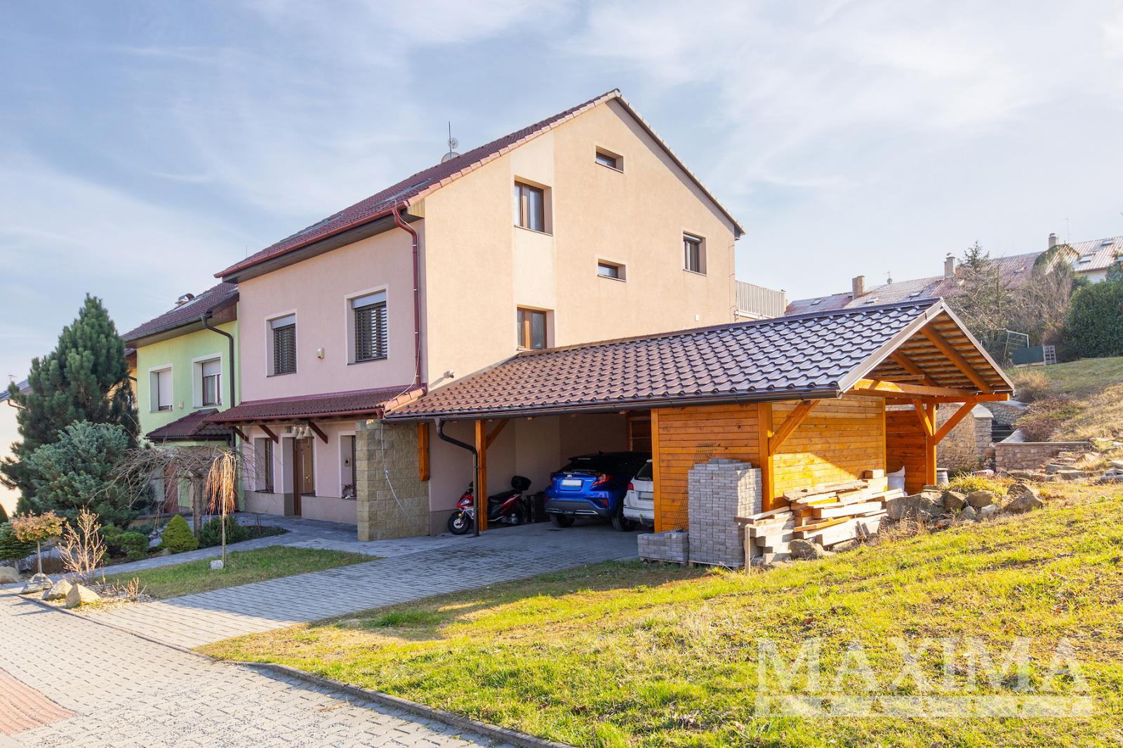 Parkování je řešeno přístřeškem pro dvě vozidla, na který navazuje praktické úložné zázemí pro zahradní vybavení a další potřeby.
