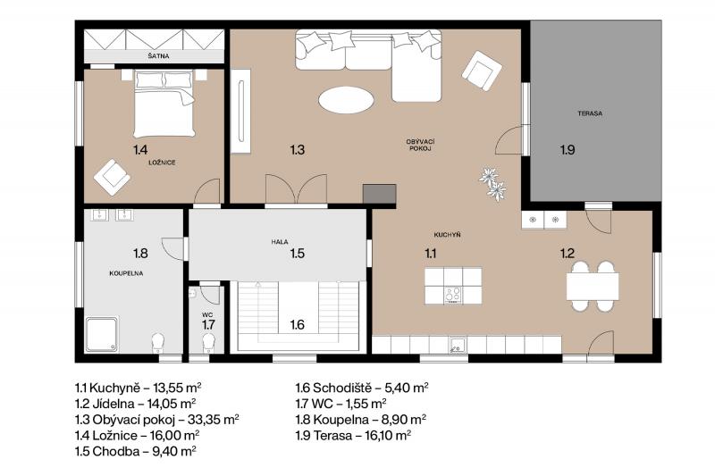 2. podlaží představuje hlavní obytný prostor s obývacím pokojem, kuchyní, jídelnou, ložnicí a vstupem na terasu