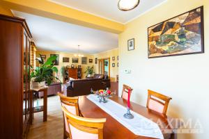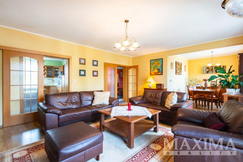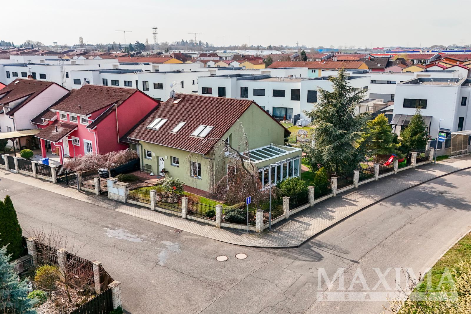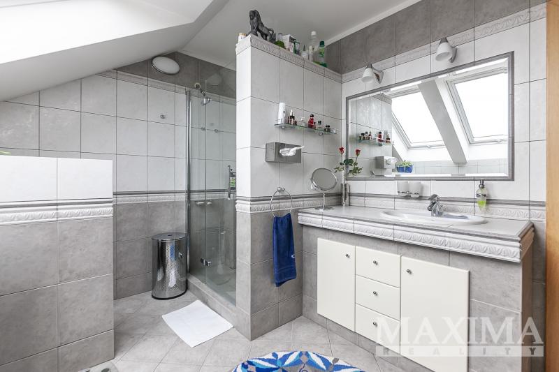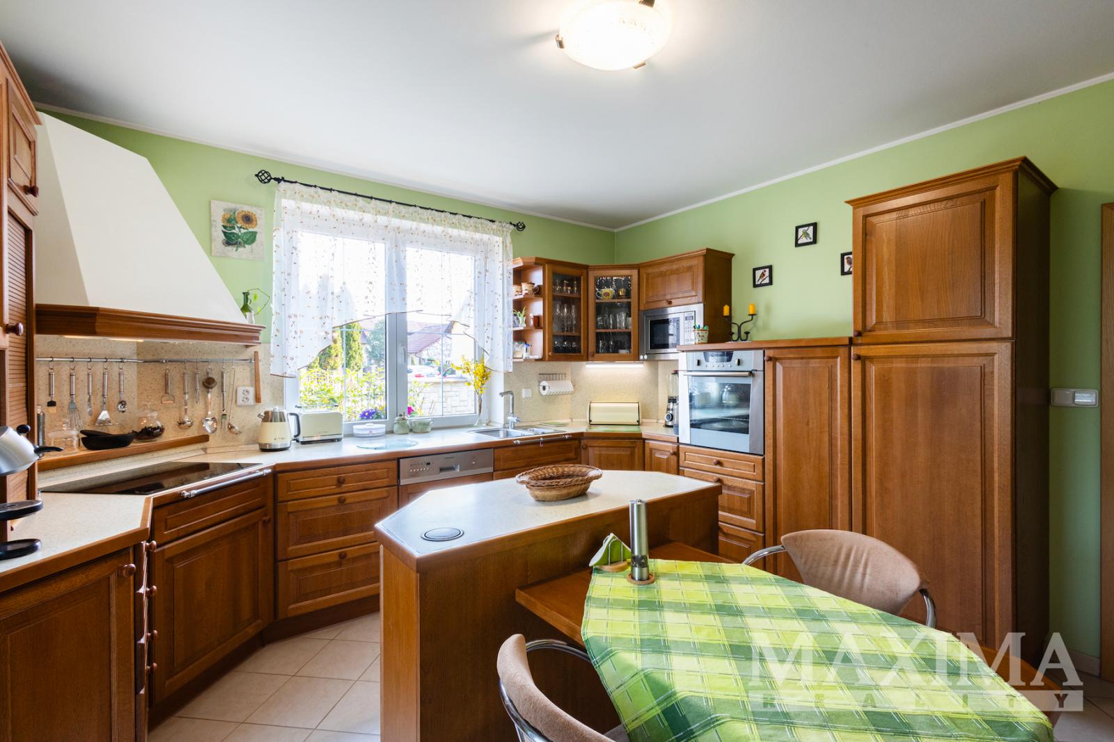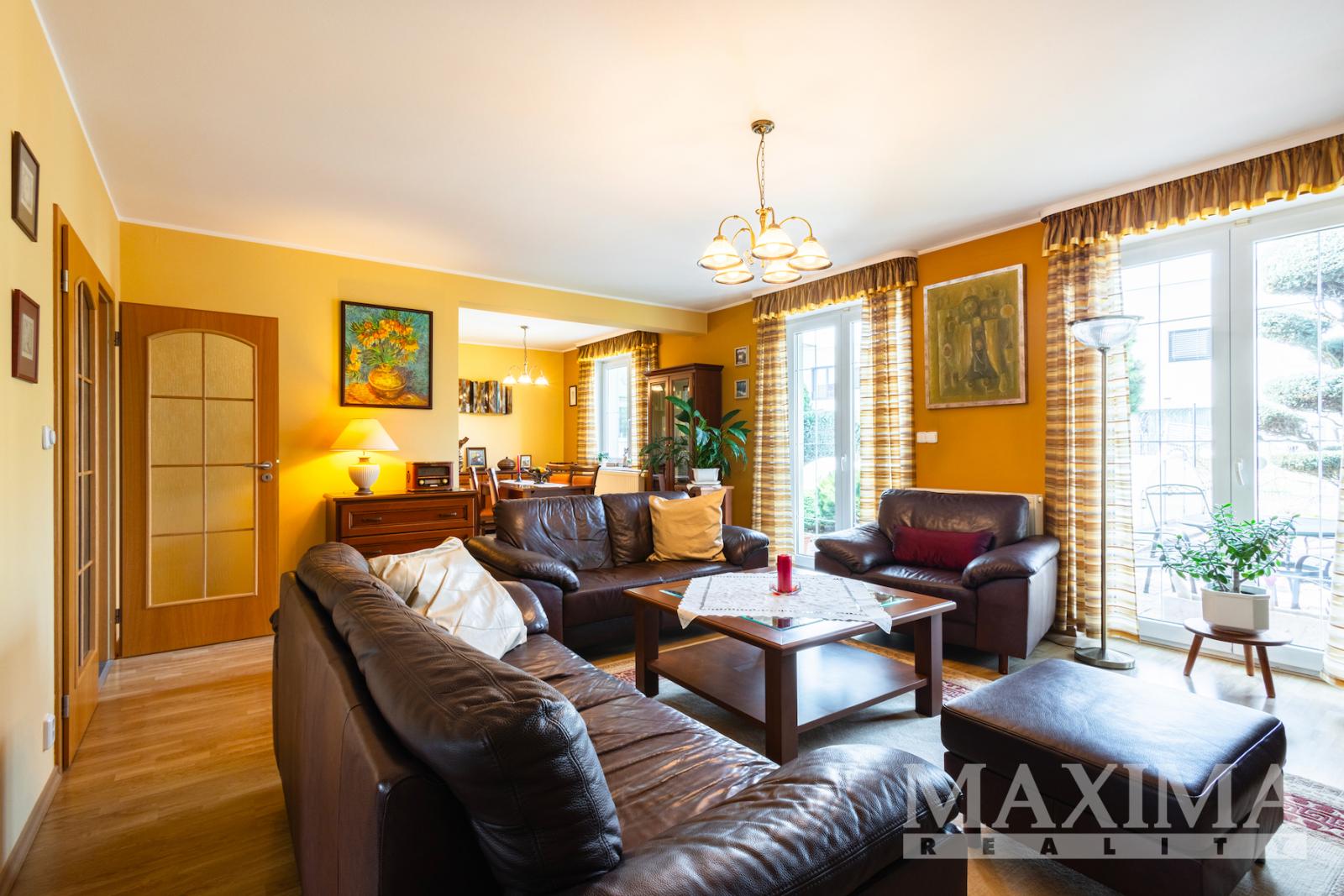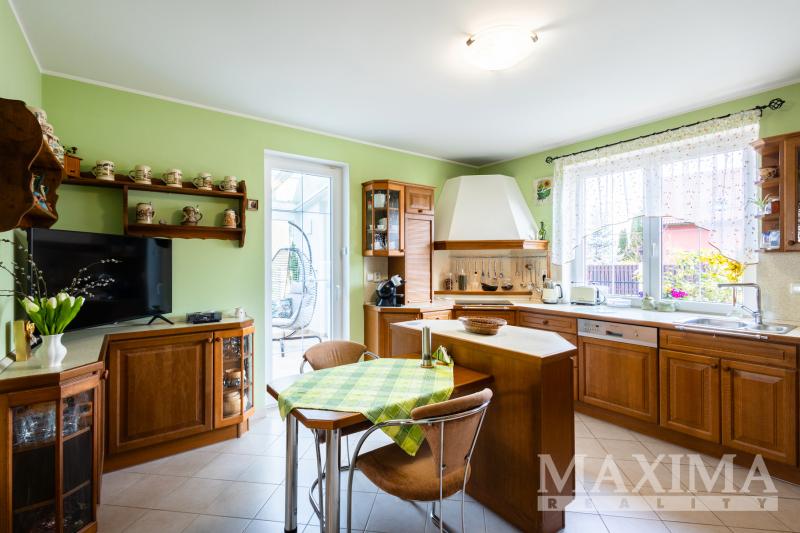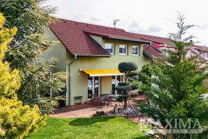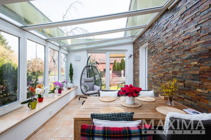 Sofistikovaně řešený prostorný dům (270 m2), zděný z Porothermu, plně vyhoví požadavkům na kvalitní bydlení. Tvoří ho v hlavní hmotě 2 nadzemní podlaží, 2.nadzemní podlaží lze doplnit v případě potřeby i v úseku nad garáží a také lze realizovat nástavbu nad zimní zahradou. 1.NP reprezentuje hlavní obytný prostor: obývací pokoj s navazující zahradní terasou, jídelnou a kuchyní. Pobytově nejoblíbenější místnost představuje zimní zahrada s výstupem francouzskými okny na nádhernou okrasnou zahradu s bonsajemi. Dispozici 1.NP dále doplňuje velká šatna, koupelna s toaletou, garáž, technická místnost, chodba, zádveří a hala se schodištěm. 2.NP obsahuje další 3 pokoje, 2 šatny a koupelnu s vanou i sprchovým koutem a WC.